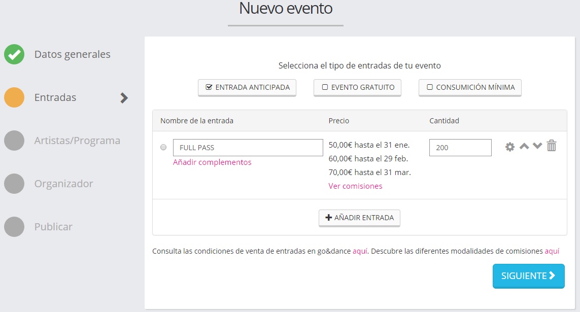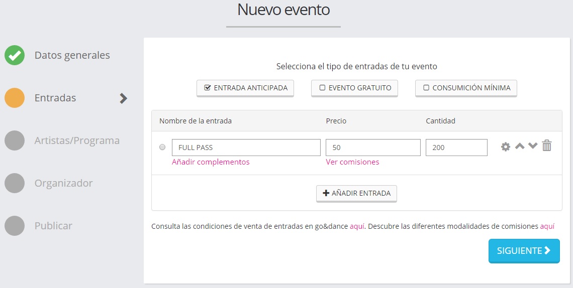 You must select the type of tickets your event has. Or you can choose between early entry, entry with minimum consumption or free entry.