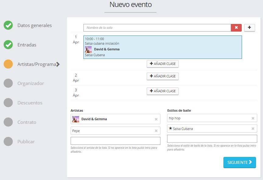 In the program section you can add the schedule of the workshops or the programming of the party in as many rooms as you want. You can also add the artists that go to the event and the dance styles.