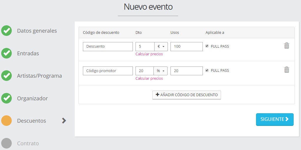 In our example we have created 2 discount codes called "discount" and "promoter code" in the first one there is 5€ discount for each Full Pass and maximum 100 codes can be used and in the second code there is 20% discount in the price of the Full Pass and maximum 20 codes can be used.