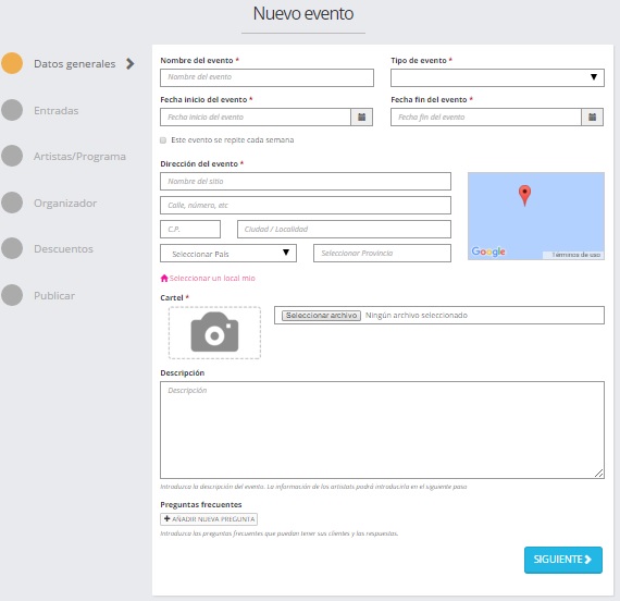 You must fill in the name of the event, the dates of the event, the type, the location, add the poster of the event, the description and the frequently asked questions.