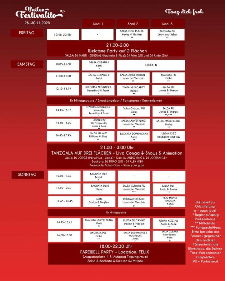 Eine Auswahl aus etwa 30 Workshops für verschiedene Stufen, mindestens 12 spezialisierte Tanzlehrer:innen, Top-DJs und Gäste aus nah und fern werden Dich glücklich machen.
