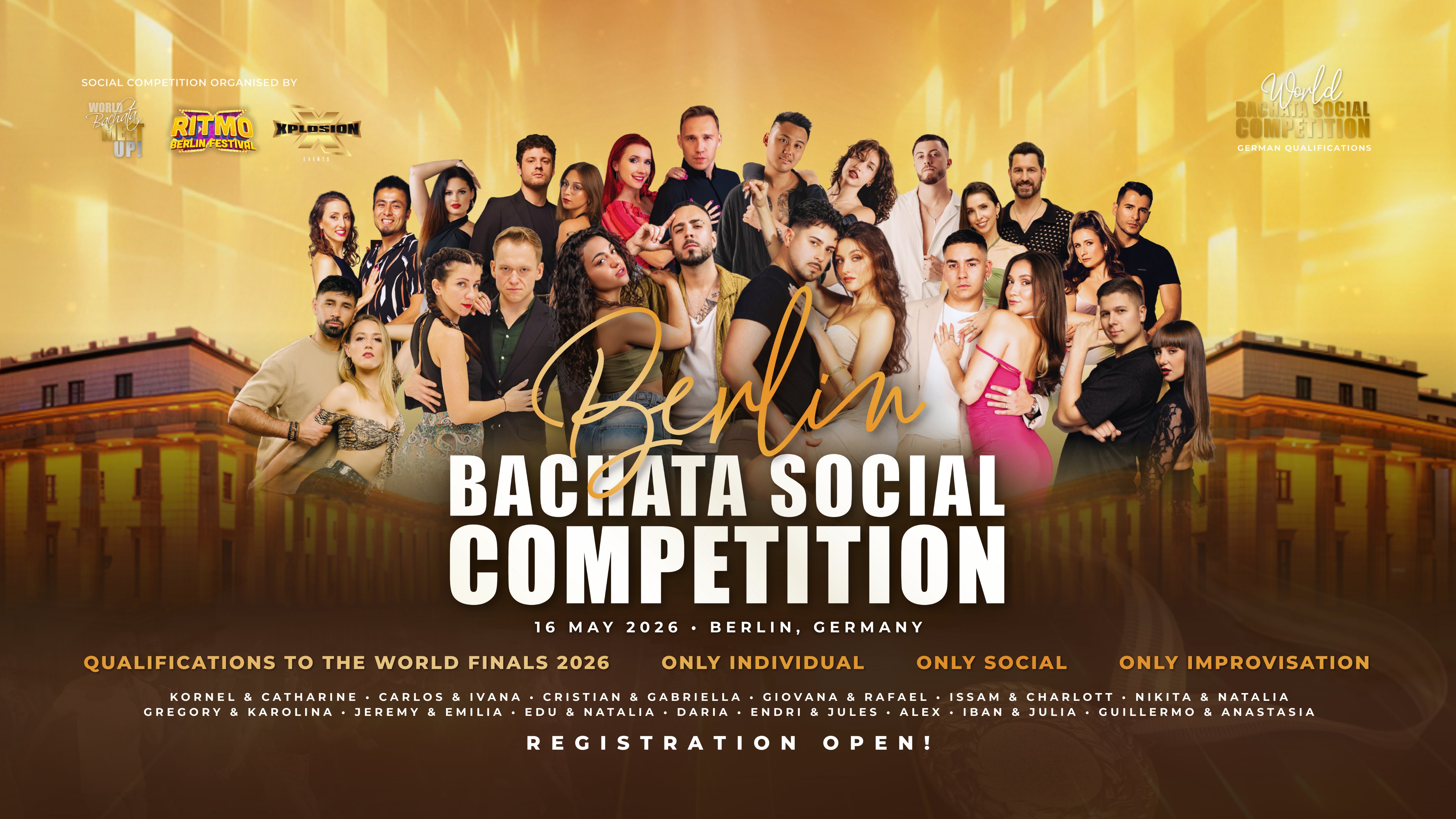 The biggest bachata social competition is spreading across Europe! Our 6th stop in 2026 is in BERLIN. The semi-finalists and finalists from Poland, France, Germany, Hungary, Portugal, Switzerland, Croatia, Sweden and Denmark (more TBA) are going to the WORLD FINALS in Autumn 2026 in Warsaw.